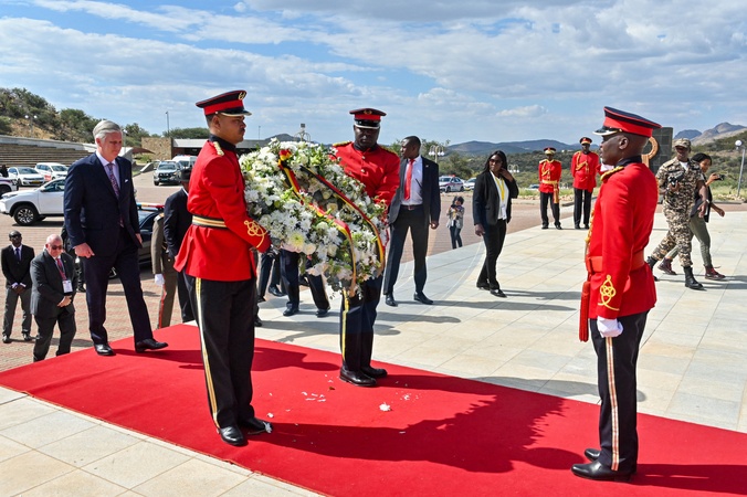 Le roi Philippe de Belgique lors de la cérémonie de dépôt de gerbes au mémorial "Heroes Acre" à Windhoek en Namibie
