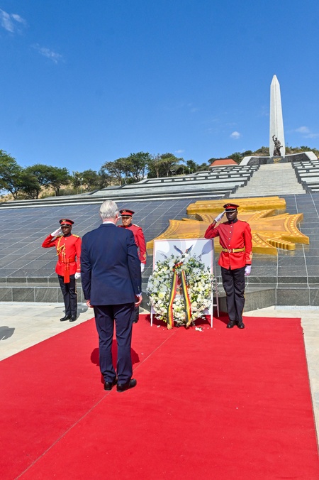 Le roi Philippe de Belgique lors de la cérémonie de dépôt de gerbes au mémorial "Heroes Acre" à Windhoek en Namibie