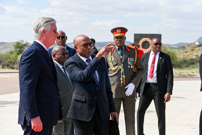 Le roi Philippe de Belgique lors de la cérémonie de dépôt de gerbes au mémorial "Heroes Acre" à Windhoek en Namibie