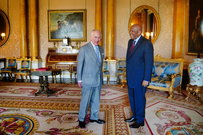 Król Karol III podczas audiencji u Letsie III, króla Lesotho w Pałacu Buckingham