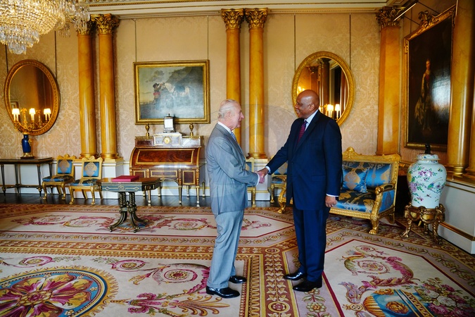 Król Karol III podczas audiencji u Letsie III, króla Lesotho w Pałacu Buckingham