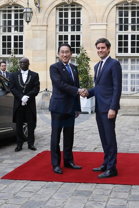 Le premier ministre Gabriel Attal reçoit Fumio Kishida, premier ministre du Japon, pour un entretien à Matignon