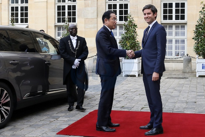 Premier Gabriel Attal przyjmuje Fumio Kishidę, premiera Japonii, na rozmowę w Matignon