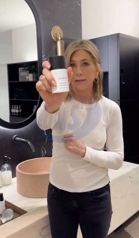 Pictures must credit: Jennifer Aniston /Instagram Friends icon Jennifer Aniston wears a revealing a clingy and revealing white top as she extols the virtues of a new hair product. The actress , 55, revealed possibly more than she intended in a short video on her Instagram page for her own LolaVie range. She explained a slew of their products to her fans in a marble bathroom in front of a mirror. Jennifer complemented the long-sleeved white top with black jeans, and gold hoop earrings. Describing the sustainable LolaVie range which she founded, she points out a detangler, shampoo and conditioner and hair oil before coming to the new product. She gushes:” I love it so much! It's paste. Hair paste. I'm so excited!" She then pumps the product onto her hands rubs them together then rub s it through her hair adding texture to her famous straight style. Jennifer then told fans in a separate post: " I'm so excited about this one! "It's taken over a year to get it just right and ALL my friends have used every one of my samples for the past year and are LOVING it. "I hope you do too!! "With love …introducing…. The Sculpting Paste!” Picture supplied by JLPPA