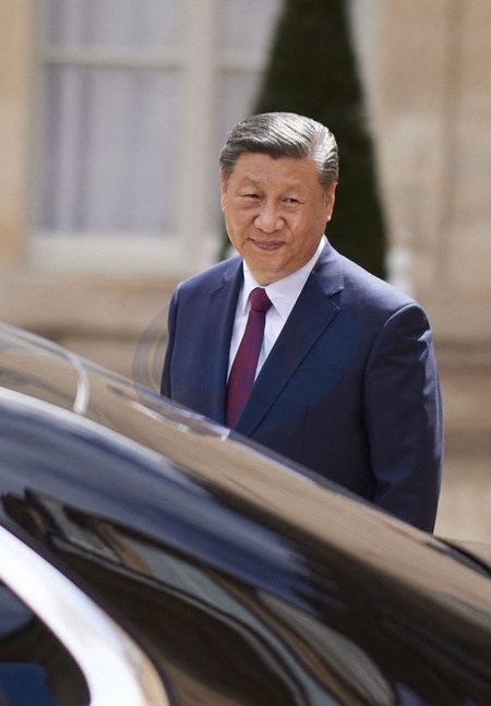 Le président de la République Emmanuel Macron raccompagne le président chinois Xi Jinping et la présidente de la Commission européenne Ursula Von Der Leyen après un entretien au palais présidentiel de l'Elysée à Paris