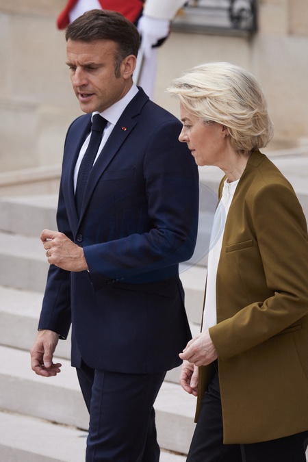 Le président de la République Emmanuel Macron raccompagne la présidente de la Commission européenne Ursula Von Der Leyen après un entretien au palais présidentiel de l'Elysée à Paris, France, le 6 mai 2024. © Cyril Moreau/Bestimage French President Emmanuel Macron accompanies European Commission president Ursula von der Leyen after a metting at the Elysee presidential palace in Paris, France, on May 6, 2024.