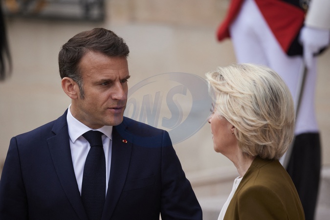 Le président de la République Emmanuel Macron raccompagne la présidente de la Commission européenne Ursula Von Der Leyen après un entretien au palais présidentiel de l'Elysée à Paris, France, le 6 mai 2024. © Cyril Moreau/Bestimage French President Emmanuel Macron accompanies European Commission president Ursula von der Leyen after a metting at the Elysee presidential palace in Paris, France, on May 6, 2024.