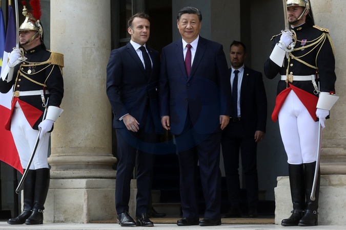 Prezydent Francji Emmanuel Macron przyjmuje Xi Jinpinga, Prezydenta Chińskiej Republiki Ludowej w Pałacu Elizejskim w Paryżu