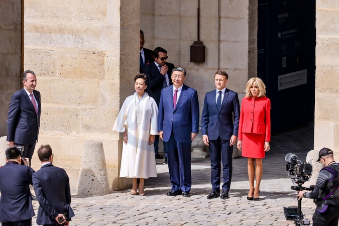 Prezydent Emmanuel Macron, Pierwsza Dama Brigitte Macron, Prezydent Xi Jinping i Pierwsza Dama Peng Liyuan podczas oficjalnej ceremonii powitania w Hôtel National des Invalides w Paryżu