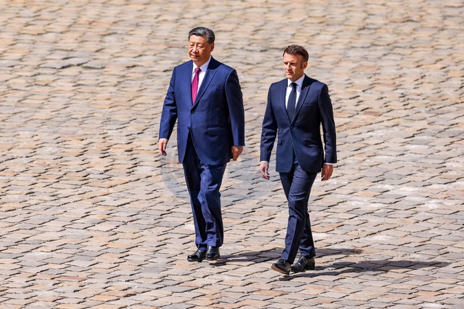 Prezydent Emmanuel Macron, Pierwsza Dama Brigitte Macron, Prezydent Xi Jinping i Pierwsza Dama Peng Liyuan podczas oficjalnej ceremonii powitania w Hôtel National des Invalides w Paryżu