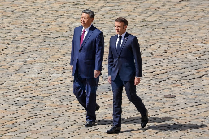 Prezydent Emmanuel Macron, Pierwsza Dama Brigitte Macron, Prezydent Xi Jinping i Pierwsza Dama Peng Liyuan podczas oficjalnej ceremonii powitania w Hôtel National des Invalides w Paryżu
