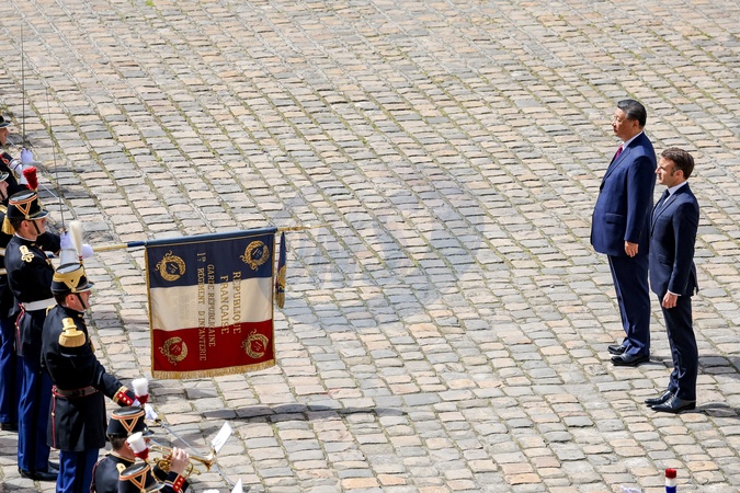 Prezydent Emmanuel Macron, Pierwsza Dama Brigitte Macron, Prezydent Xi Jinping i Pierwsza Dama Peng Liyuan podczas oficjalnej ceremonii powitania w Hôtel National des Invalides w Paryżu