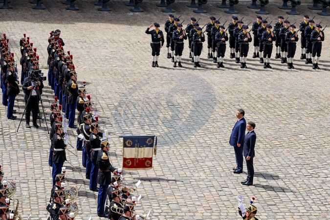 Prezydent Emmanuel Macron, Pierwsza Dama Brigitte Macron, Prezydent Xi Jinping i Pierwsza Dama Peng Liyuan podczas oficjalnej ceremonii powitania w Hôtel National des Invalides w Paryżu
