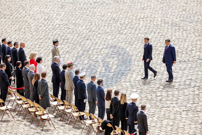 Prezydent Emmanuel Macron, Pierwsza Dama Brigitte Macron, Prezydent Xi Jinping i Pierwsza Dama Peng Liyuan podczas oficjalnej ceremonii powitania w Hôtel National des Invalides w Paryżu