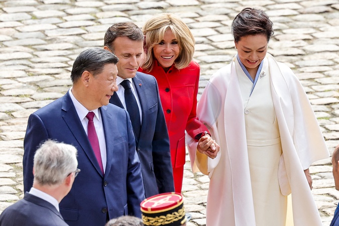 Prezydent Emmanuel Macron, Pierwsza Dama Brigitte Macron, Prezydent Xi Jinping i Pierwsza Dama Peng Liyuan podczas oficjalnej ceremonii powitania w Hôtel National des Invalides w Paryżu