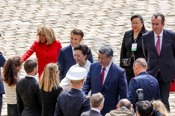 Prezydent Emmanuel Macron, Pierwsza Dama Brigitte Macron, Prezydent Xi Jinping i Pierwsza Dama Peng Liyuan podczas oficjalnej ceremonii powitania w Hôtel National des Invalides w Paryżu