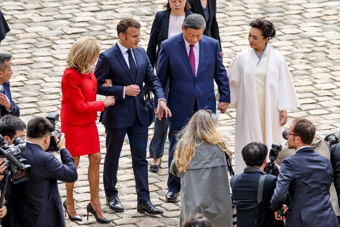 Prezydent Emmanuel Macron, Pierwsza Dama Brigitte Macron, Prezydent Xi Jinping i Pierwsza Dama Peng Liyuan podczas oficjalnej ceremonii powitania w Hôtel National des Invalides w Paryżu