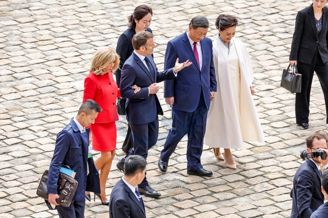 Prezydent Emmanuel Macron, Pierwsza Dama Brigitte Macron, Prezydent Xi Jinping i Pierwsza Dama Peng Liyuan podczas oficjalnej ceremonii powitania w Hôtel National des Invalides w Paryżu
