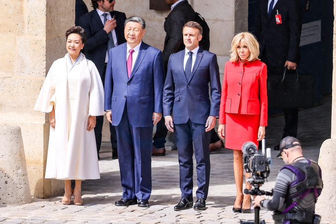 Prezydent Emmanuel Macron, Pierwsza Dama Brigitte Macron, Prezydent Xi Jinping i Pierwsza Dama Peng Liyuan podczas oficjalnej ceremonii powitania w Hôtel National des Invalides w Paryżu