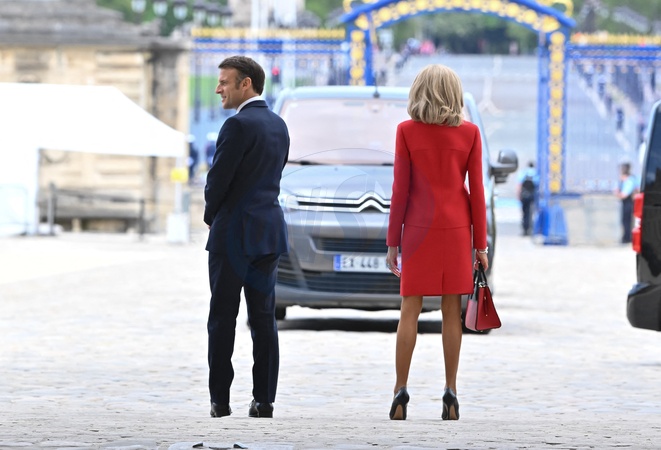 Le président Emmanuel Macron, sa femme la Première Dame Brigitte Macron, le président chinois et sa femme la Première Dame lors de la cérémonie d'accueil officiel à l'Hôtel national des Invalides à Paris, France, le 6 mai 2024. © Jacques Witt/Pool/Bestimage French President Emmanuel Macron and his wife Brigitte Macron wait for the arrival of the Chinese President and his wife during the official welcoming ceremony, as part of the Chinese President's two-day state visit, at The Invalides in Paris on May 6, 2024.