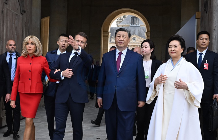 Prezydent Emmanuel Macron, Pierwsza Dama Brigitte Macron, Prezydent Xi Jinping i Pierwsza Dama Peng Liyuan podczas oficjalnej ceremonii powitania w Hôtel National des Invalides w Paryżu