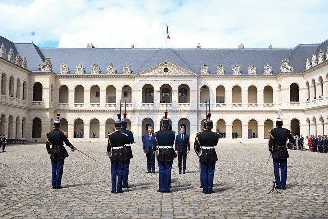 Prezydent Emmanuel Macron, Pierwsza Dama Brigitte Macron, Prezydent Xi Jinping i Pierwsza Dama Peng Liyuan podczas oficjalnej ceremonii powitania w Hôtel National des Invalides w Paryżu