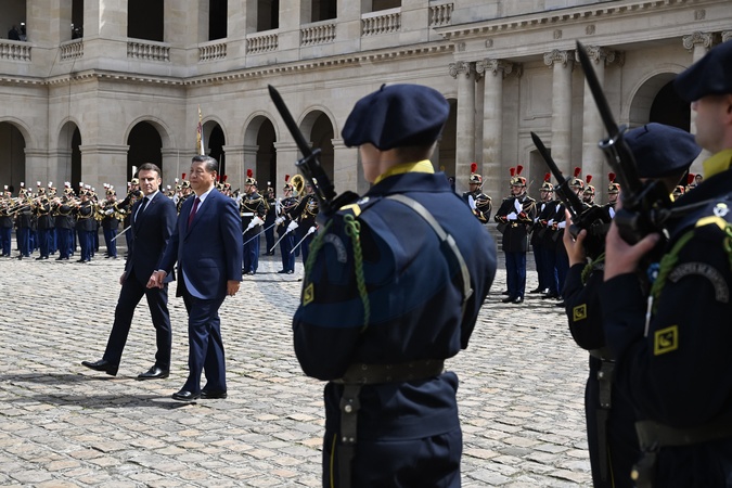 Le président Emmanuel Macron et le président chinois Xi Jinping lors de la cérémonie d'accueil officiel à l'Hôtel national des Invalides à Paris, France, le 6 mai 2024. © Jacques Witt/Pool/Bestimage lors de la cérémonie d'accueil officiel à l'Hôtel national des Invalides à Paris, France, le 6 mai 2024. © Jacques Witt/Pool/Bestimage President of France Emmanuel Macron and President of the People's Republic of China Xi Jinping inspect the troops at a ceremony in Hôtel des Invalides during the Chinese President's State Visit to France on May 06, 2024 in Paris, France