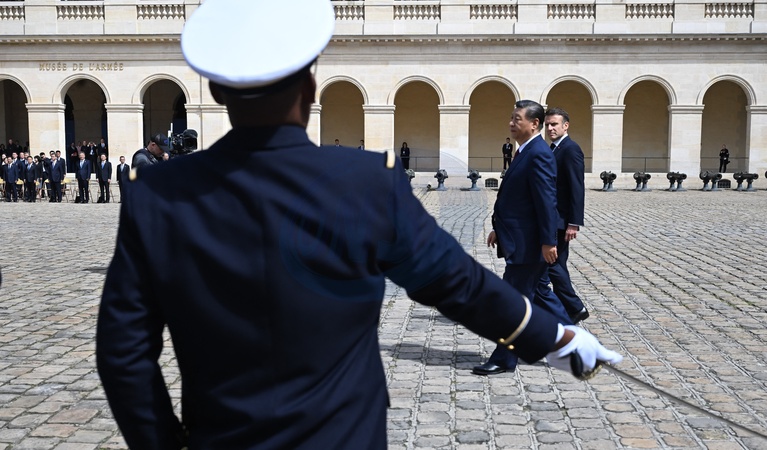Prezydent Emmanuel Macron, Pierwsza Dama Brigitte Macron, Prezydent Xi Jinping i Pierwsza Dama Peng Liyuan podczas oficjalnej ceremonii powitania w Hôtel National des Invalides w Paryżu