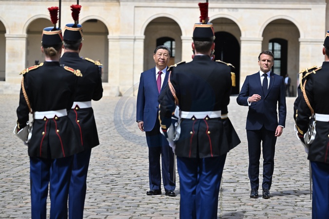 Le président Emmanuel Macron et le président chinois Xi Jinping lors de la cérémonie d'accueil officiel à l'Hôtel national des Invalides à Paris, France, le 6 mai 2024. © Jacques Witt/Pool/Bestimage lors de la cérémonie d'accueil officiel à l'Hôtel national des Invalides à Paris, France, le 6 mai 2024. © Jacques Witt/Pool/Bestimage President of France Emmanuel Macron and President of the People's Republic of China Xi Jinping inspect the troops at a ceremony in Hôtel des Invalides during the Chinese President's State Visit to France on May 06, 2024 in Paris, France
