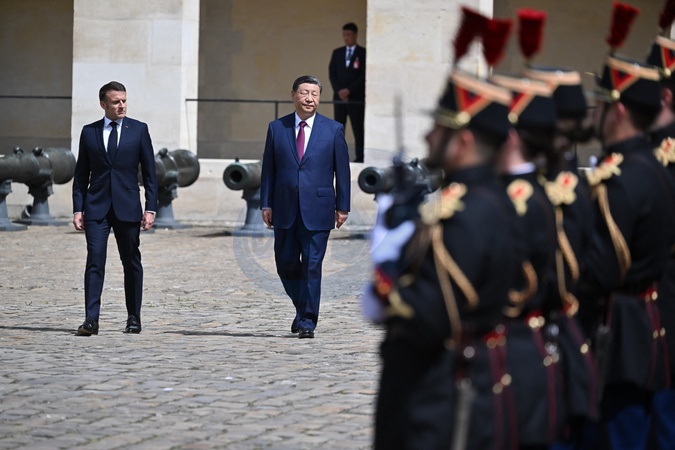 Prezydent Emmanuel Macron, Pierwsza Dama Brigitte Macron, Prezydent Xi Jinping i Pierwsza Dama Peng Liyuan podczas oficjalnej ceremonii powitania w Hôtel National des Invalides w Paryżu