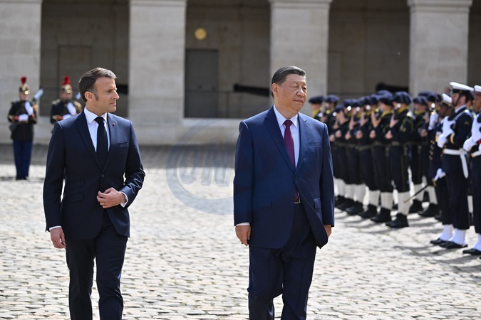 Le président Emmanuel Macron et le président chinois Xi Jinping lors de la cérémonie d'accueil officiel à l'Hôtel national des Invalides à Paris, France, le 6 mai 2024. © Jacques Witt/Pool/Bestimage lors de la cérémonie d'accueil officiel à l'Hôtel national des Invalides à Paris, France, le 6 mai 2024. © Jacques Witt/Pool/Bestimage President of France Emmanuel Macron and President of the People's Republic of China Xi Jinping inspect the troops at a ceremony in Hôtel des Invalides during the Chinese President's State Visit to France on May 06, 2024 in Paris, France