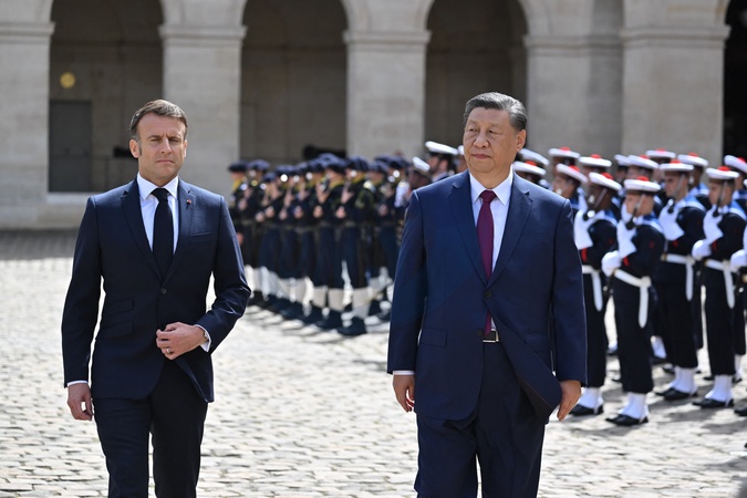 Le président Emmanuel Macron et le président chinois Xi Jinping lors de la cérémonie d'accueil officiel à l'Hôtel national des Invalides à Paris, France, le 6 mai 2024. © Jacques Witt/Pool/Bestimage lors de la cérémonie d'accueil officiel à l'Hôtel national des Invalides à Paris, France, le 6 mai 2024. © Jacques Witt/Pool/Bestimage President of France Emmanuel Macron and President of the People's Republic of China Xi Jinping inspect the troops at a ceremony in Hôtel des Invalides during the Chinese President's State Visit to France on May 06, 2024 in Paris, France