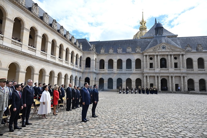 Prezydent Emmanuel Macron, Pierwsza Dama Brigitte Macron, Prezydent Xi Jinping i Pierwsza Dama Peng Liyuan podczas oficjalnej ceremonii powitania w Hôtel National des Invalides w Paryżu
