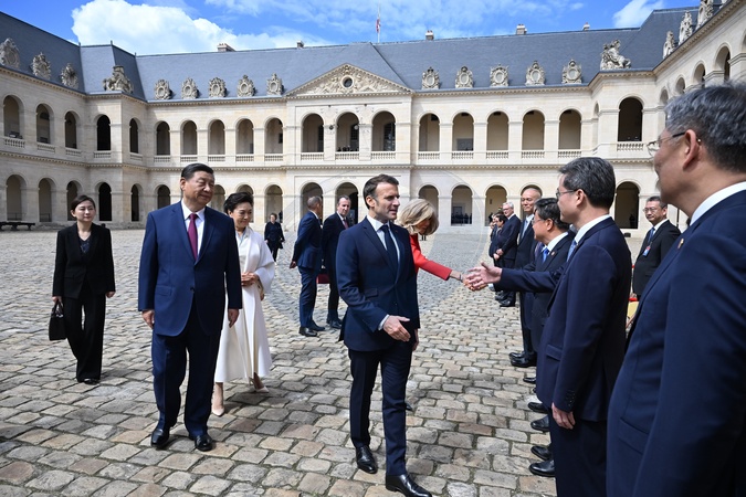 Prezydent Emmanuel Macron, Pierwsza Dama Brigitte Macron, Prezydent Xi Jinping i Pierwsza Dama Peng Liyuan podczas oficjalnej ceremonii powitania w Hôtel National des Invalides w Paryżu