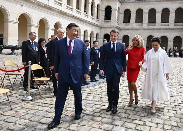Prezydent Emmanuel Macron, Pierwsza Dama Brigitte Macron, Prezydent Xi Jinping i Pierwsza Dama Peng Liyuan podczas oficjalnej ceremonii powitania w Hôtel National des Invalides w Paryżu