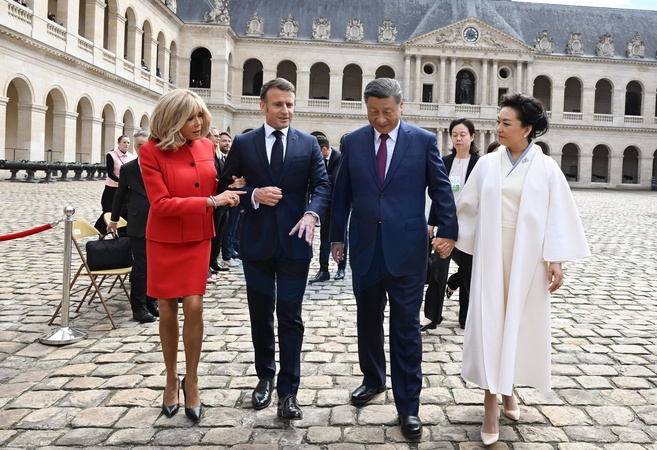 Prezydent Emmanuel Macron, Pierwsza Dama Brigitte Macron, Prezydent Xi Jinping i Pierwsza Dama Peng Liyuan podczas oficjalnej ceremonii powitania w Hôtel National des Invalides w Paryżu