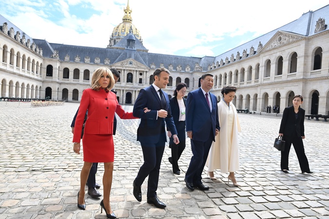 Prezydent Emmanuel Macron, Pierwsza Dama Brigitte Macron, Prezydent Xi Jinping i Pierwsza Dama Peng Liyuan podczas oficjalnej ceremonii powitania w Hôtel National des Invalides w Paryżu