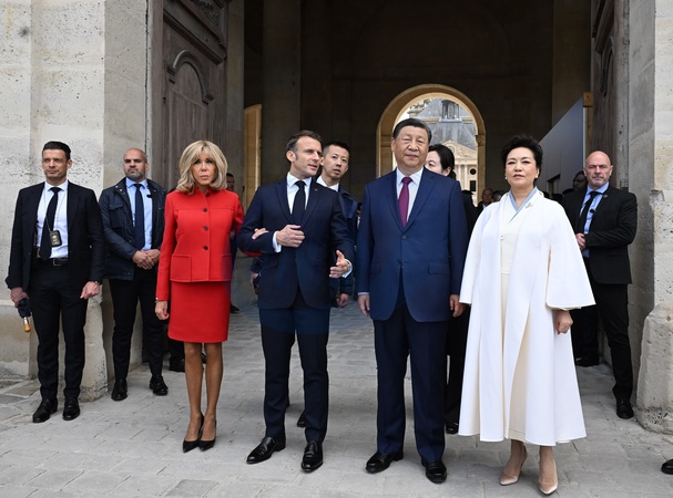 Prezydent Emmanuel Macron, Pierwsza Dama Brigitte Macron, Prezydent Xi Jinping i Pierwsza Dama Peng Liyuan podczas oficjalnej ceremonii powitania w Hôtel National des Invalides w Paryżu