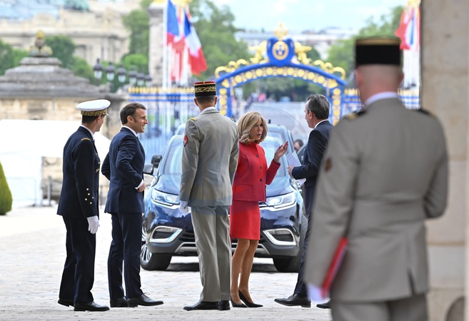 Prezydent Emmanuel Macron, Pierwsza Dama Brigitte Macron, Prezydent Xi Jinping i Pierwsza Dama Peng Liyuan podczas oficjalnej ceremonii powitania w Hôtel National des Invalides w Paryżu