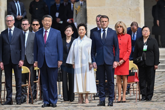 Prezydent Emmanuel Macron, Pierwsza Dama Brigitte Macron, Prezydent Xi Jinping i Pierwsza Dama Peng Liyuan podczas oficjalnej ceremonii powitania w Hôtel National des Invalides w Paryżu