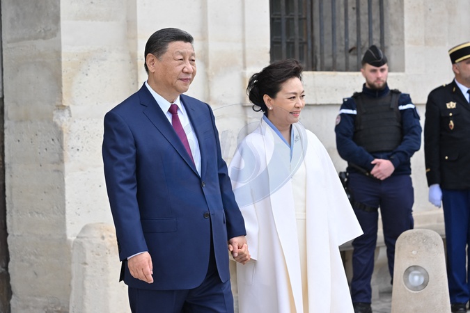 Le président chinois Xi Jinping et sa femme la Première Dame Peng Liyuan lors de la cérémonie d'accueil officiel à l'Hôtel national des Invalides à Paris, France, le 6 mai 2024. © Jacques Witt/Pool/Bestimage Chinese President Xi Jinping and his wife Peng Liyuan, attend the official welcoming ceremony, as part of the Chinese President's two-day state visit, at The Invalides in Paris on May 6, 2024.