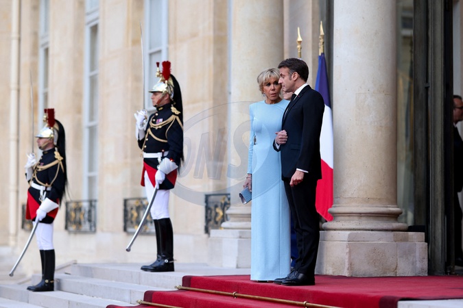 La Première Dame Brigitte Macron et son mari le président Emmanuel Macron - Arrivée des invités au dîner d'Etat en l'honneur du président chinois Xi Jinping et de sa femme la Première Dame Peng Liyuan au palais présidentiel de l'Elysée à Paris, France, le 6 mai 2024. © Cyril Moreau/Bestimage Celebs arrive to attend an official state dinner as part of the Chinese president's two-day state visit to France, at the Presidential Elysee Palace in Paris, France, on May 6, 2024.