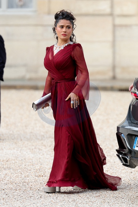 Salma Hayek et son mari François-Henri Pinault - Arrivée des invités au dîner d'Etat en l'honneur du président chinois Xi Jinping et de sa femme la Première Dame Peng Liyuan au palais présidentiel de l'Elysée à Paris, France, le 6 mai 2024. © Cyril Moreau/Bestimage Celebs arrive to attend an official state dinner as part of the Chinese president's two-day state visit to France, at the Presidential Elysee Palace in Paris, France, on May 6, 2024.