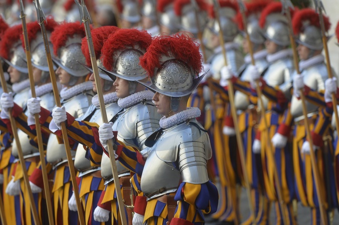 Nowi rekruci elitarnej Gwardii Szwajcarskiej Watykanu podczas ceremonii zaprzysiężenia