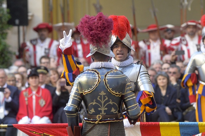 Nowi rekruci elitarnej Gwardii Szwajcarskiej Watykanu podczas ceremonii zaprzysiężenia