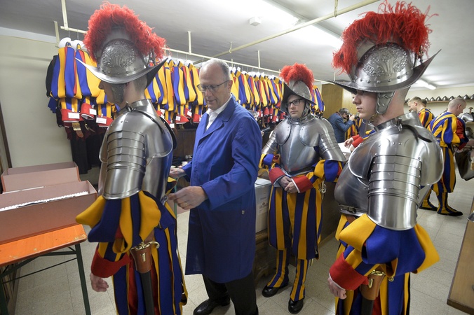 Nowi rekruci elitarnej Gwardii Szwajcarskiej Watykanu podczas ceremonii zaprzysiężenia
