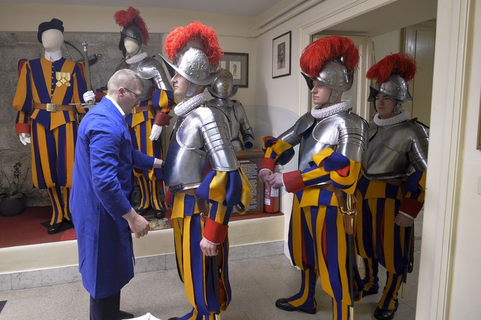 Nowi rekruci elitarnej Gwardii Szwajcarskiej Watykanu podczas ceremonii zaprzysiężenia