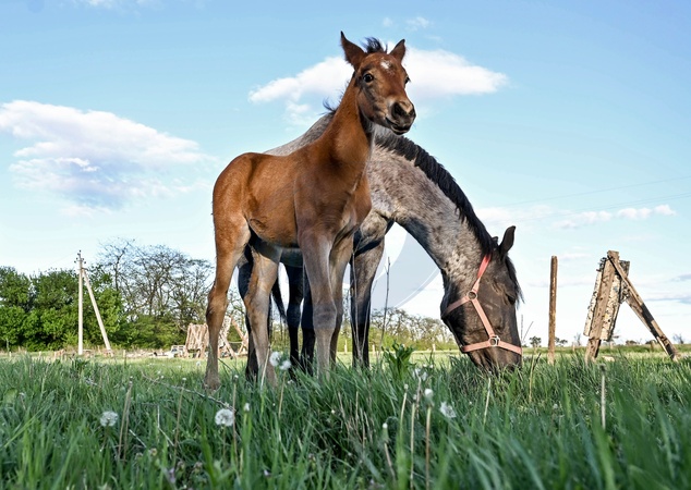 ZAPORIZHZHIA, UKRAINE - APRIL 19, 2024 - A foal stays by a horse grazing on the grass on Khortytsia Island, Zaporizhzhia, southeastern Ukraine., Credit:Dmytro Smolienko / Avalon