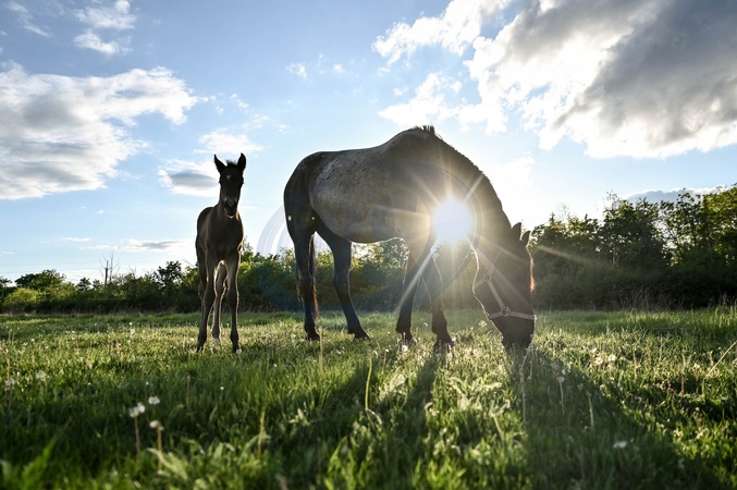 ZAPORIZHZHIA, UKRAINE - APRIL 19, 2024 - A foal stays by a horse grazing on the grass on Khortytsia Island, Zaporizhzhia, southeastern Ukraine., Credit:Dmytro Smolienko / Avalon