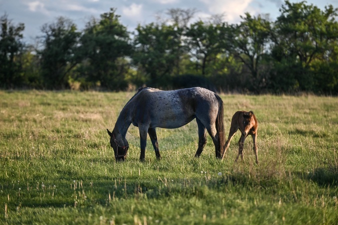 ZAPORIZHZHIA, UKRAINE - APRIL 19, 2024 - A foal stays by a horse grazing on the grass on Khortytsia Island, Zaporizhzhia, southeastern Ukraine., Credit:Dmytro Smolienko / Avalon